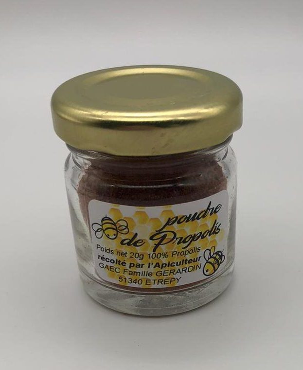 La propolis pure en poudre de notre exploitation, conditionnée dans un petit pot en verre de 20 Gr.